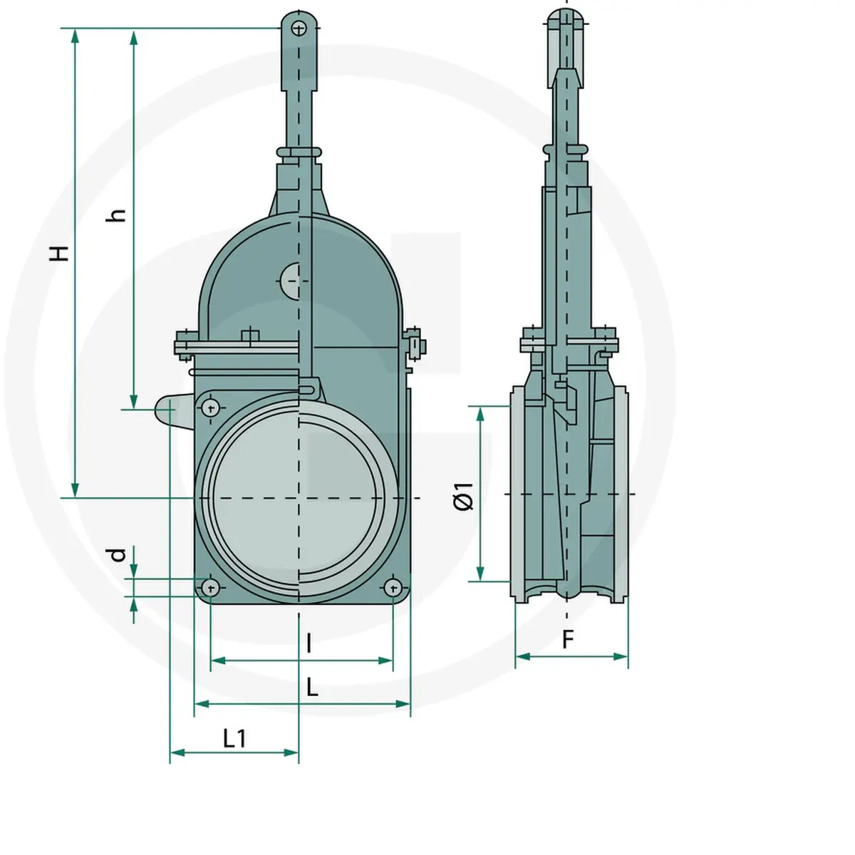 Zasuwa ECO 6'' MZ jest wyposażona w szerokość nominalną (Ø1) 145mm, typ zasuwy - klinową, bez obsługi, typ przyłącza kołnierz - kołnierz, grubość zasuwy (F) 90mm, rozstaw od otworu widełek do najbliższego otworu kołnierza (h) 324mm, rozstaw od otworu widełek do otworu złącza (H) 400mm, średnica otworów kołnierza (d) 13mm, rozstaw otworów kołnierza (l) 150mm i szerokość zasuwy (L) 180mm.