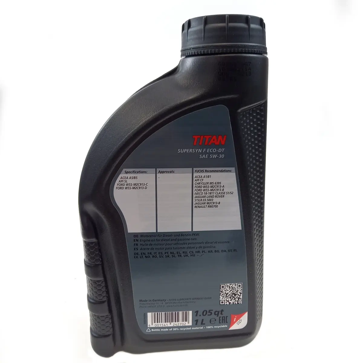 • Olej silnikowy Fuchs Titan Supersyn F ECO-DT 5W-30 1L - wysokiej jakości olej silnikowy spełniający normy ACEA A5/B5 i API SL. Rekomendowany przez producentów takich jak Ford, Chrysler, Jaguar i Renault. Idealny do samochodów osobowych i dostawczych. Dost